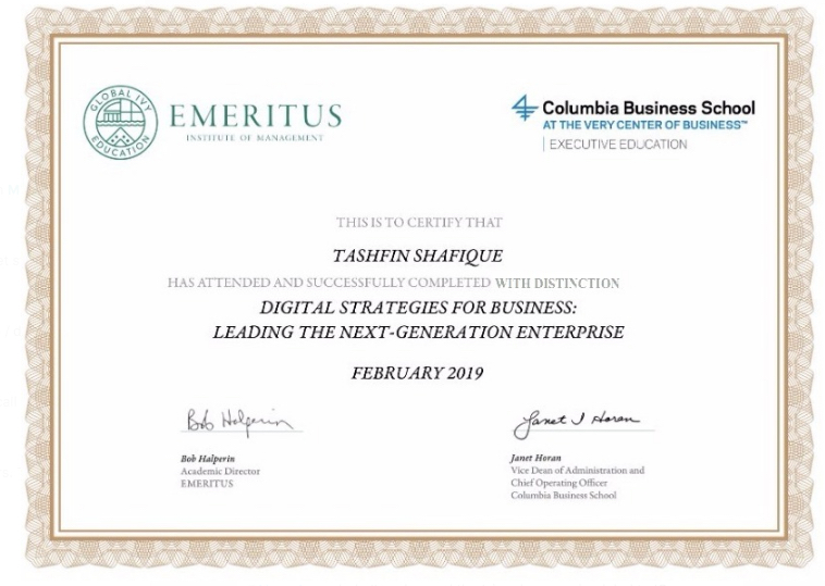 We would like to congratulate our Managing Partner & Founder Tashfin Shafique in completing his Digital Strategies for Business Executive course from Columbia Business School. The course is in line with our Digital Transformation and Data Science Practice and will further support our clients, partners and colleagues in applying cutting edge solutions.